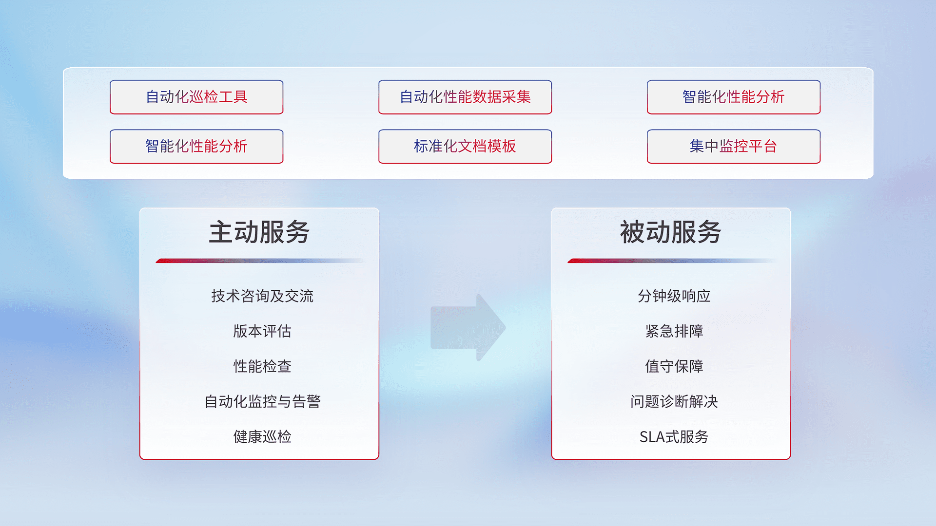 智能化工具和标准化文档,,,,保障服务质量,,,,提供主动服务(包含技术咨询、、、版本评估、、性能检查、、、自动化监控与告警、、、健康巡检)和被动服务包含(分钟级响应、、紧急排障、、、、值守保障、、问题诊断解决、、、、SLA服务)。。。